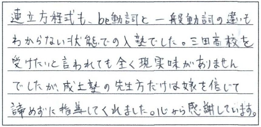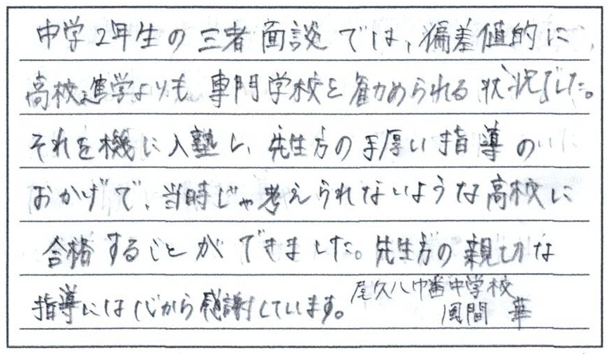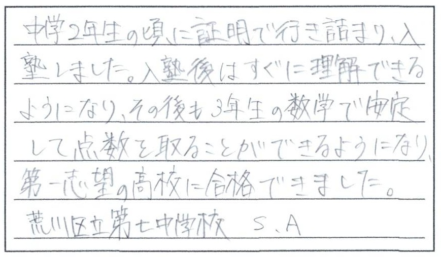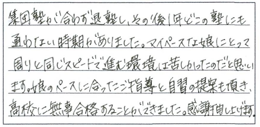 集団塾で理解しきれない単元を教えていただきました。楽しく毎週通っていたのだが印象的でした。授業がない日も最後は毎日自習に通い、一番苦手だった国語が一番得意になり、安定して得点できるようになりました。先生が常に言っていた「丁寧に」が合格につながる大切なポイントだったと実感しています。お陰で念願の第一希望に合格することができました。
